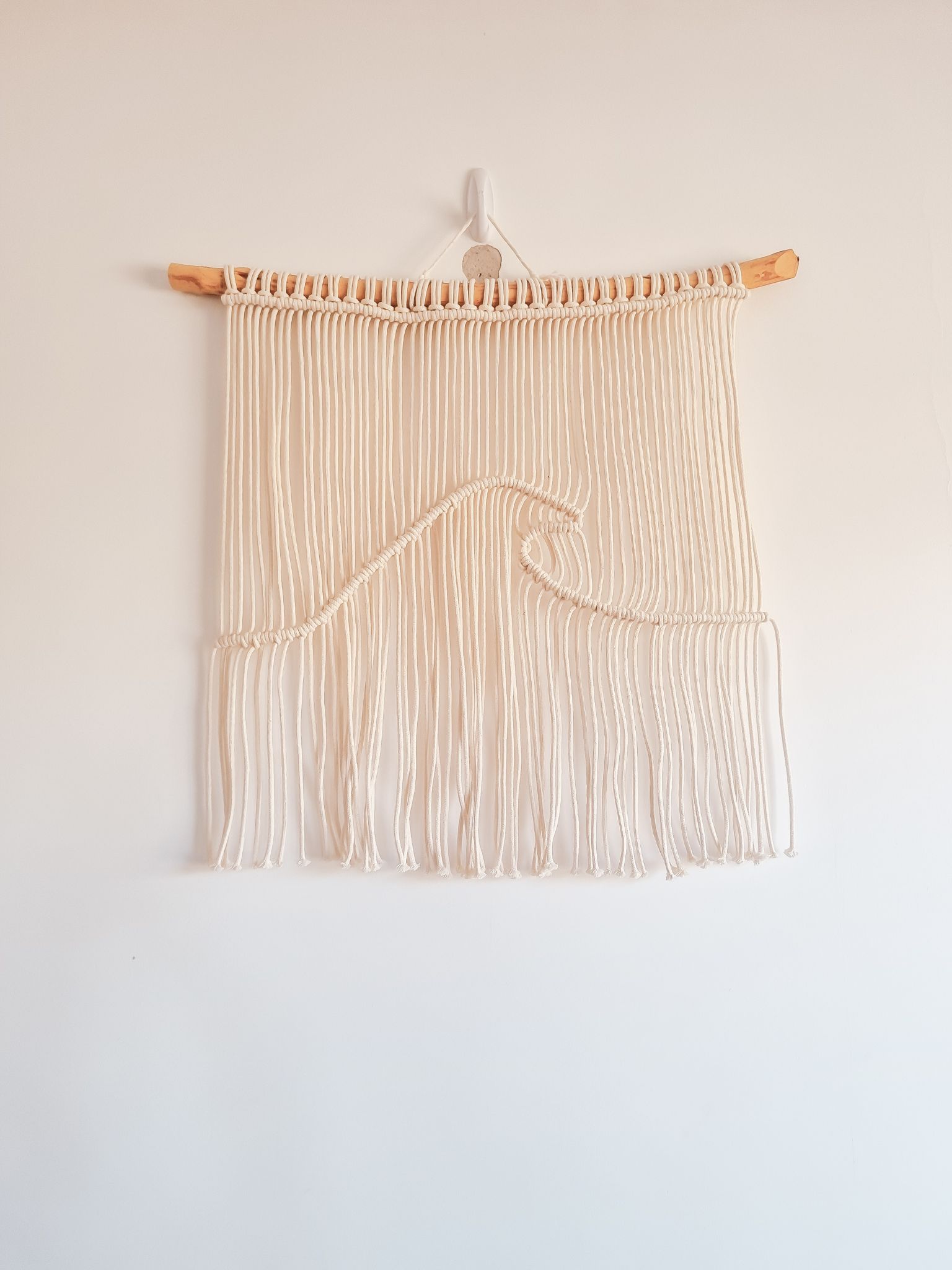 Painel decorativo feito com linha de algodão. Pode ser produzido em suporte de madeira pinus ou galho de árvore.